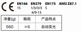自動(dòng)變光電焊面屏,PC鏡片,帶有吸汗帶,棘輪式可調(diào)節(jié)頭帶,太陽(yáng)能充電功能,可替換電池。100 x 60毫米。 遮光量(亮態(tài)): 4級(jí) 遮光量(暗態(tài)): 9-13級(jí),可調(diào)節(jié) 開(kāi)關(guān)時(shí)間: ≤0.000033秒(亮態(tài)-暗態(tài)); 0.1-1秒(暗態(tài)-亮態(tài))使用溫度: -5℃至+55℃