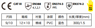 PVC涂層棉絨襯里手套,無縫全涂層,擁有卓越的防水和防化學性能。針對多種化學品提供有效防護,機械防護性能出色。掌面和掌背均有防滑,光滑袖口,能更好的抓住濕滑物體。高品質棉絨襯里,有效降低皮膚刺激性,提高舒適度。 適用化學加工、煉油、接觸脂和酸等粗糙材料環(huán)境。