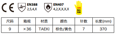 TAEKI系列高溫防切割手套,7針,長15厘米的抗熱牛皮袖口,全棉襯里,短時間可耐高溫250-300℃/15秒,防止機械傷害的全能保護手套,卓越的防切割性,抗撕裂性能。 適用于熱玻璃處理,高溫消毒,脫模熱塑等行業。