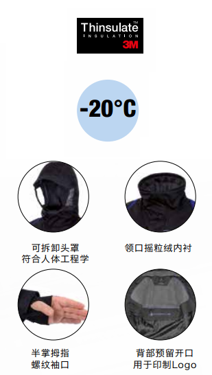 PU點(diǎn)塑透氣型戶外防寒服,獨(dú)特的熒光條設(shè)計(jì),防水接縫,可脫卸兜帽隱藏式拉鏈,防風(fēng)前片襟及拇指防風(fēng)袖口,3M新雪麗保暖填充物,可抵御-20°C嚴(yán)寒。防中雨,透氣排汗、干爽舒適。