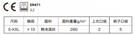 兩件套熒光夾克,54%棉46%滌,260g/m2,松緊袖口, 反光等級2級,黑黃高亮警戒色,條紋狀設(shè)計提高視覺沖擊,有效起到熒光警示作用,適合室內(nèi)外多種天氣穿著。