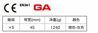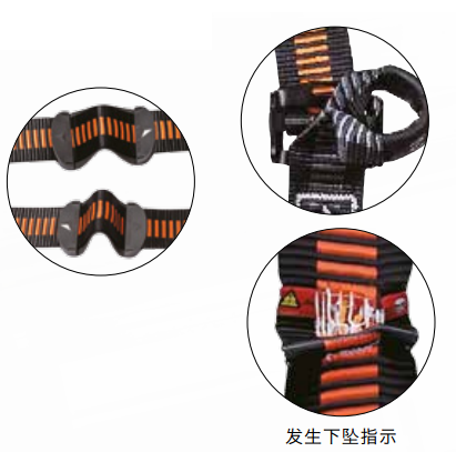 雙調三掛點安全帶,配有2個前側爬梯掛點和1個背部掛點,橙/灰雙色橫條高強度織帶,肩部配有Riplight波型減壓調節扣,左肩胛部配有下墜指示器,黑色超大型連接環。HAR23胸部加強扣環。 屬于消防二類安全帶。通過國家消防裝備質量監督檢驗中心消防檢測。