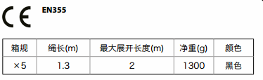 SECUREX系列單大鉤減震繩,靜力繩,配有1個(gè)鋼制O型鉤AM002和1個(gè)鋼制大鉤AM022,繩索直徑12毫米,長(zhǎng)1.3m,最大彈力展開(kāi)長(zhǎng)度2m,重1.3kg。